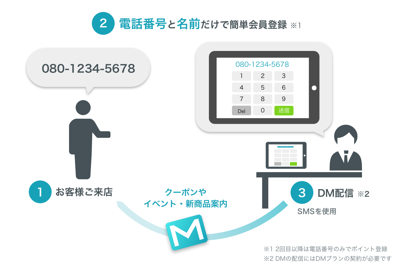 ポイントシステムにご登録のお客様に新商品やイベントなどを開封率の高いSMSで直接配信できます。一括配信・定期配信にも対応しています。